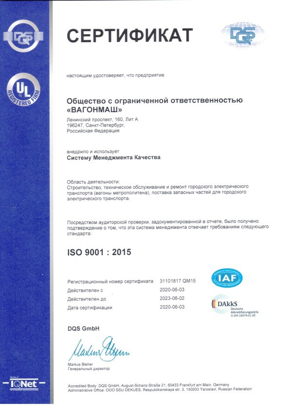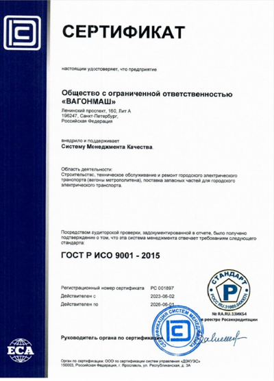 По результатам аудита установлено, что Система Менеджмента Качества компании соответствует требованиям стандарта ISO 9001:2015 применительно к строительству, техническому обслуживанию, ремонту городского электрического транспорта (вагонов метрополитена) и поставке запасных частей